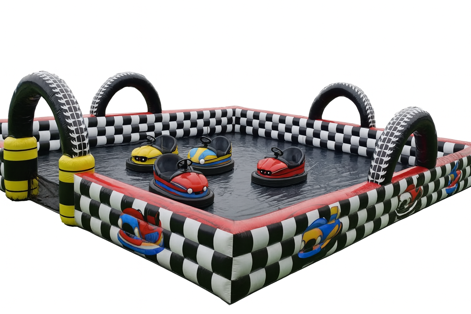 35x25x8’ Bring the thrill of the carnival to your event with our inflatable Bumper Car Arena! This oversized track comes with 4 bumper cars and a friendly attendant to keep the fun running smoothly. Drivers can spin, bump, and laugh their way through nonstop excitement while the checkered-flag design and tire-arch entrances set the stage for a true racetrack experience.